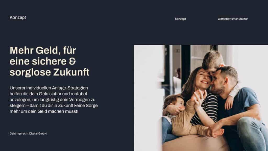 Die gewählte Farbpalette. Zuerst kommt ein dunkles Blau, das Wertigkeit und Seriosität ausdrückt. Dann ein helles Blau, das Vertrauen und Sicherheit suggeriert. Und als Akzentfarbe Orange-Gold-Ton.Eine Collage aus sieben verschiedenen Bildern, die Wünsche der potenziellen Kunden der Wirtschaftsmanufaktur zeigen. Man sieht unter anderem eine Familie mit Kindern, ein Haus, ein Pool und einen Mann der mit seiner Mutter glücklich tanzt.